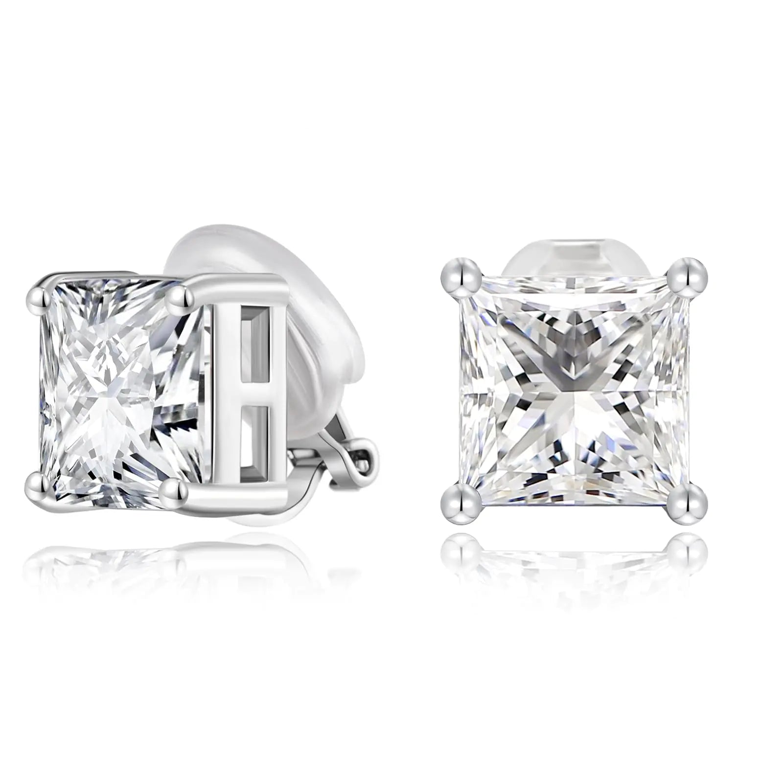 FAMARINE Silver Clip on Earrings Women CZ Square Clip Earrings Non-pierced Earrings Fake Earrings